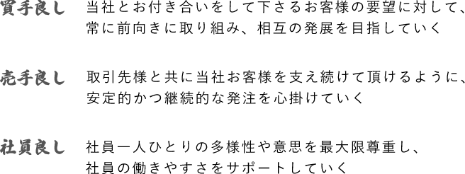 経営理念である『買い手良し、売り手良し、社員良し』は創業以来かわらない共存共栄の精神がもとになります。半世紀以上の経営の中で、時には苦しい時代を乗り越えられたのは当社を支えて頂いている全ての皆様のお陰であると感謝申し上げます。